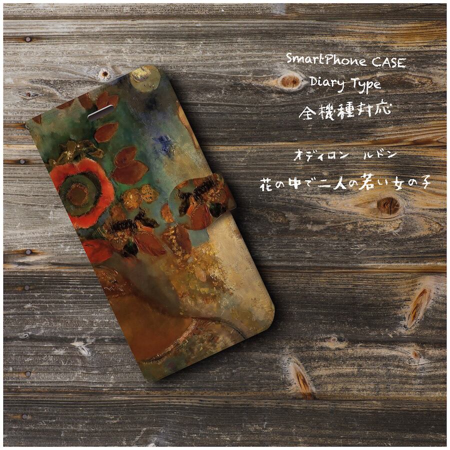 iPhoneSE ケース アンドロイド スマホケース 手帳型 絵画 全機種対応 ケース 人気 あいふぉん オディロン ルドン 花の中で二人の若い女の子